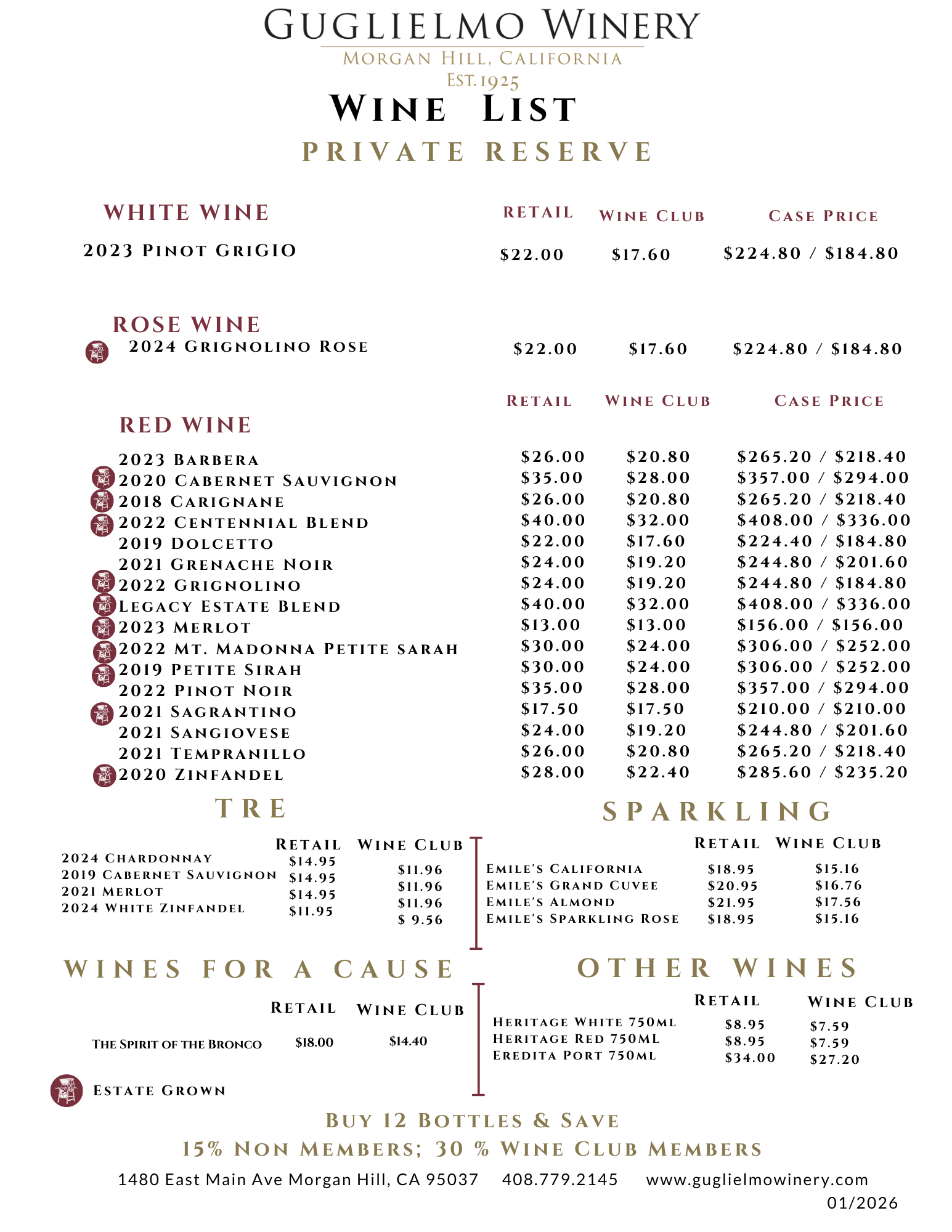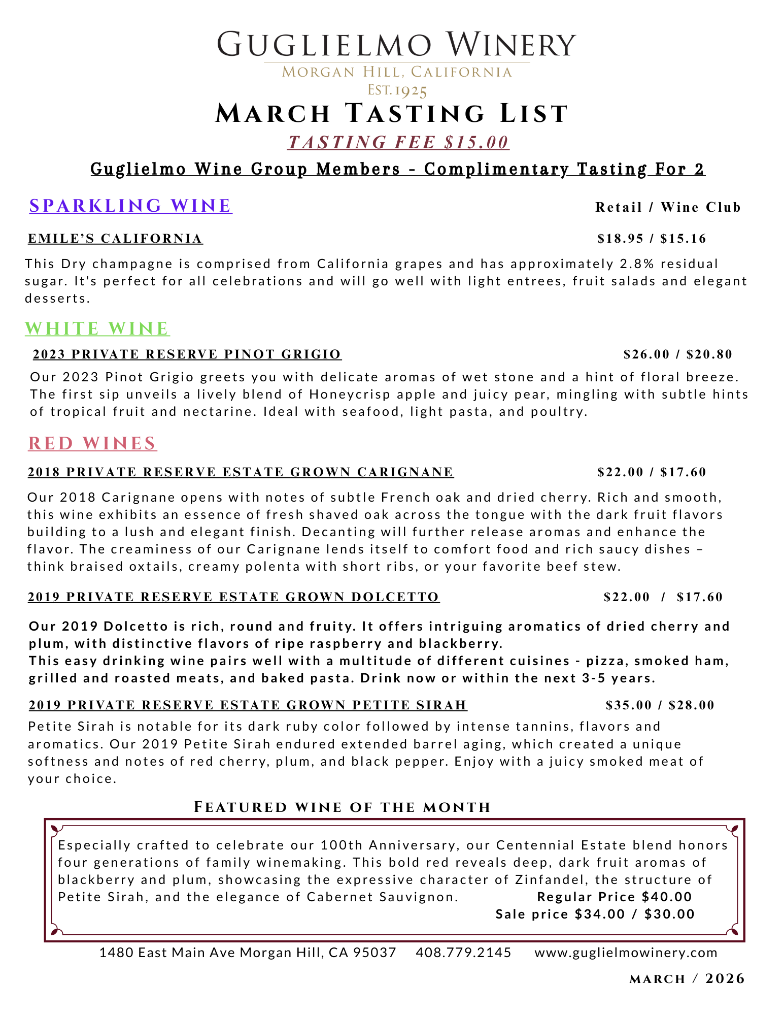 Indulge in a curated tasting experience at Guglielmo Family Winery, where tradition meets excellence. Our Tasting List Menu offers a selection of exceptional wines for $15 per person. (Wine Club Members enjoy a complimentary wine tasting for up to two people.)
