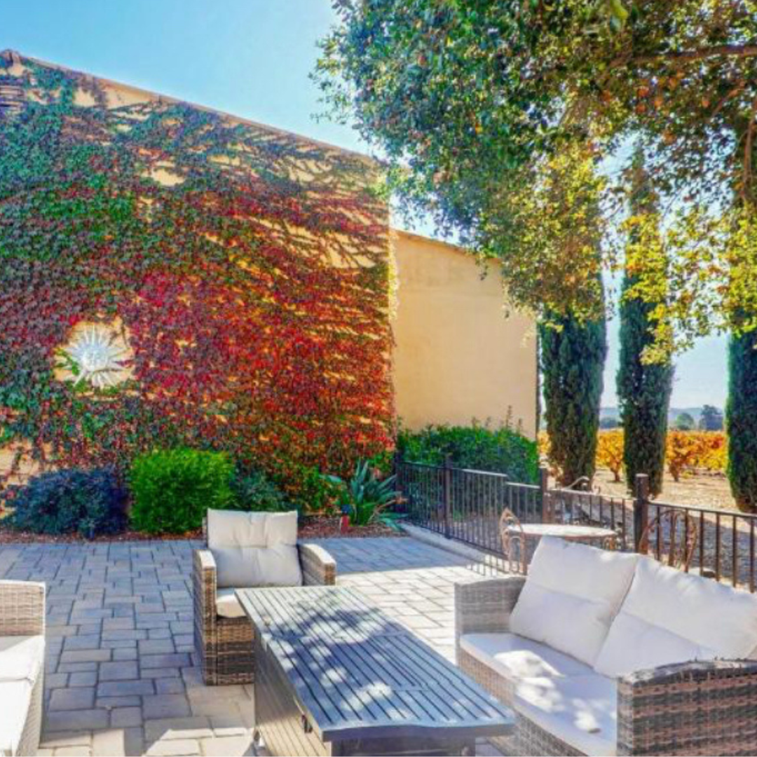 Unwind on your private patio, featuring a cozy fire pit and stunning vineyard views.